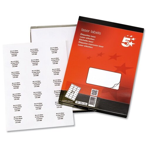 Address Laser Labels 21 per Sheet 63.5x38.1mm White 2100 Labels 5 Star - Hunt Office Ireland